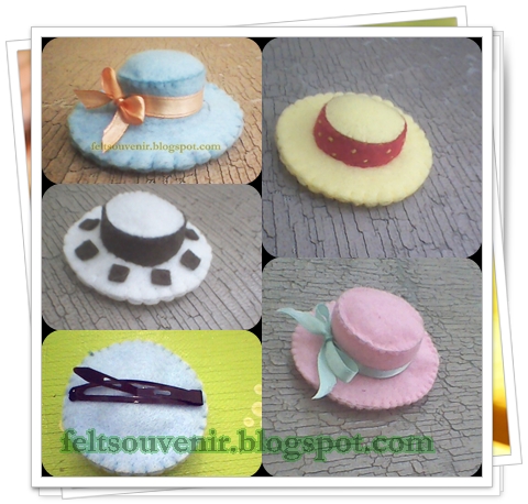4. Isi dengan dakron. Beri sedikit lem / double tape. lalu yempelkan flanel C di atasnya. Jahit semua tepinya. Kemudian beri lem lilin di bagian jepit besi, tempelkan ke flanel, dan beri hiasan pita di atas topi.
